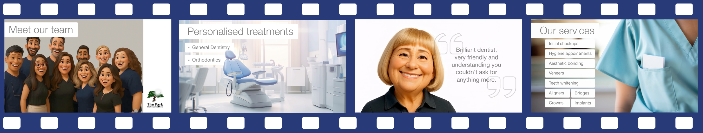 Our films are customised to your brand featuring your logo, team, treatments, and even real patient testimonials. Designed for dental websites, social media, and waiting room screens, they give your practice the competitive edge it deserves.